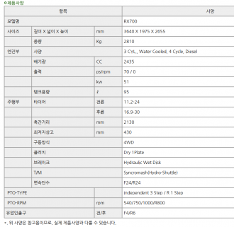 대동/트랙터/규격문의/RX700 본체 첼리 E210 로타리