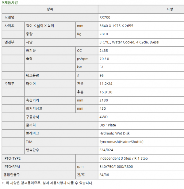 제조사 | 대동 | 모델명 | RX700 | 규격 | 70마력 |