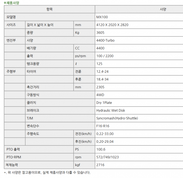 | 제조사 | 대동 | 모델명 | MX100 | 규격 | 100마력 |