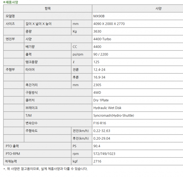 | 제조사 | 대동 | 모델명 | MX90 로더,로타리,파워셔틀 전자유압 | 규격 | 90마력 |