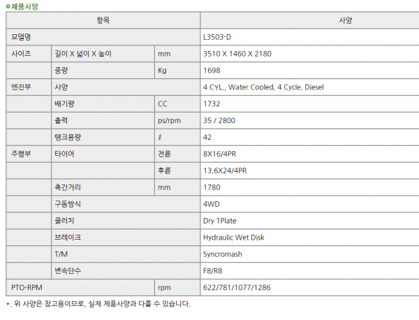 | 제조사 | 대동 | 모델명 | L3503-D | 규격 | 35마력 |