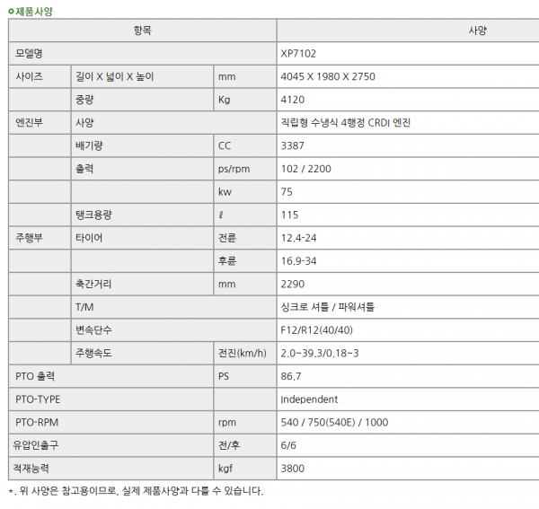 | 제조사 | LS | 모델명 | XP7102-SPS-AT 로더,버킷,로타리,쟁기,원터치,배토기 | 규격 | 102마력 |