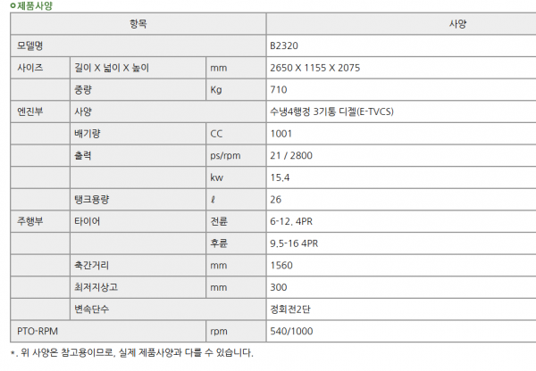 | 제조사 | 구보다 | 모델명 | B2320 | 규격 | 20.9마력 |