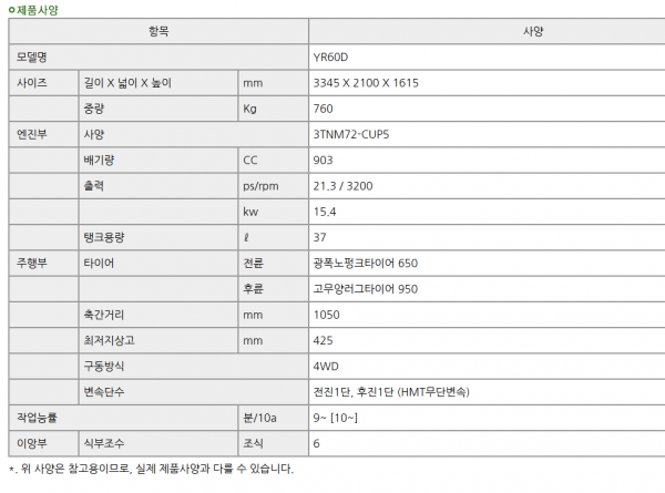 | 제조사 | 얀마 | 모델명 | YR60D | 규격 | 6조식 |