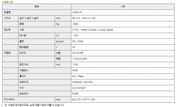 | 제조사 | 대동 | 모델명 | L3503 | 규격 | 30-39hp |