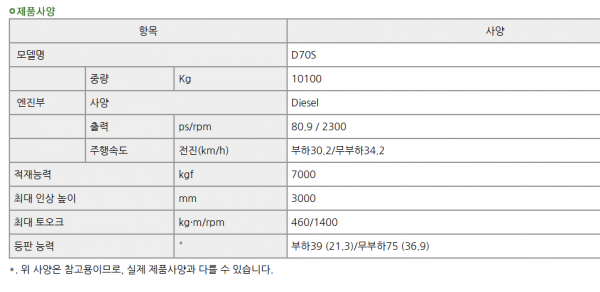 | 제조사 | 두산중공업 | 모델명 | D70S-5 | 규격 | 7톤 |