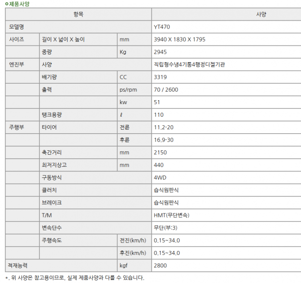 | 제조사 | 얀마 | 모델명 | YT470 | 규격 | 70마력 |
