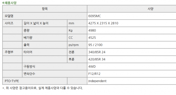 | 제조사 | 존디어 | 모델명 | 6095MC | 규격 | 95마력 |