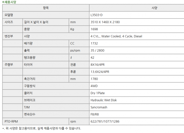 | 제조사 | 대동 | 모델명 | L3503 | 규격 | 35마력 |