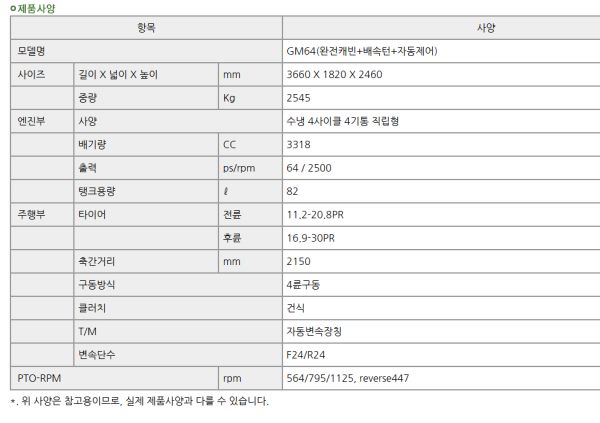 | 제조사 | 구보다 | 모델명 | GM64 | 규격 | 64마력 |