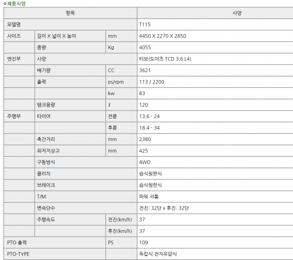 | 제조사 | TYM | 모델명 | T115 | 규격 | 115마력 |