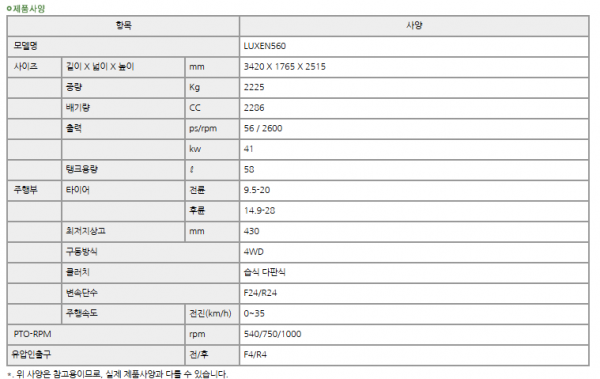 | 제조사 | 국제 | 모델명 | LUXEN560 | 규격 | 50-59hp |