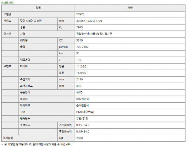 | 제조사 | 얀마 | 모델명 | YT470 | 규격 | 70-79hp |