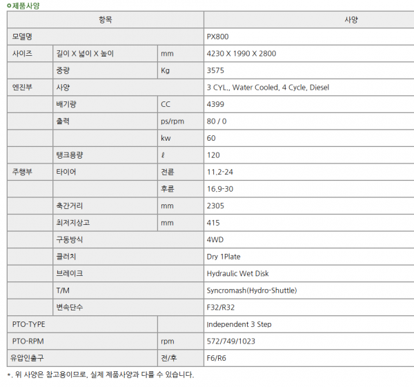 | 제조사 | 대동 | 모델명 | PX800PSC | 규격 | 80마력 |