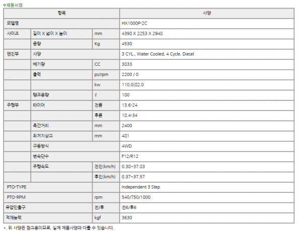 | 제조사 | 대동 | 모델명 | HX1000 | 규격 | 110-119hp |