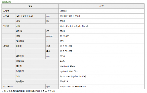 | 제조사 | 구보다 | 모델명 | MZ763 | 규격 | 70-79hp |