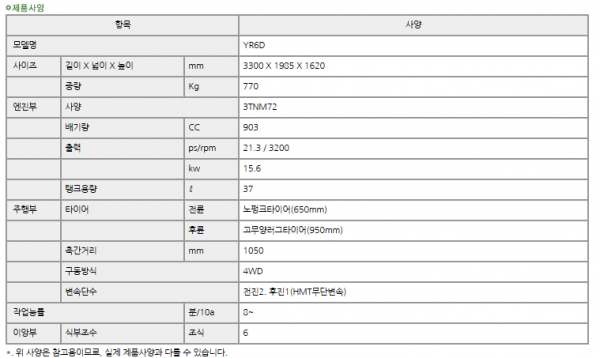 | 제조사 | 얀마 | 모델명 | YR6D | 규격 | 6조식 승용 |