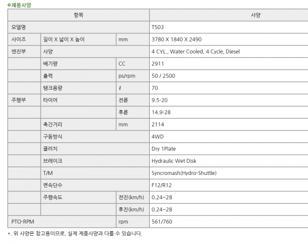 | 제조사 | TYM | 모델명 | T503 | 규격 | 50마력 |