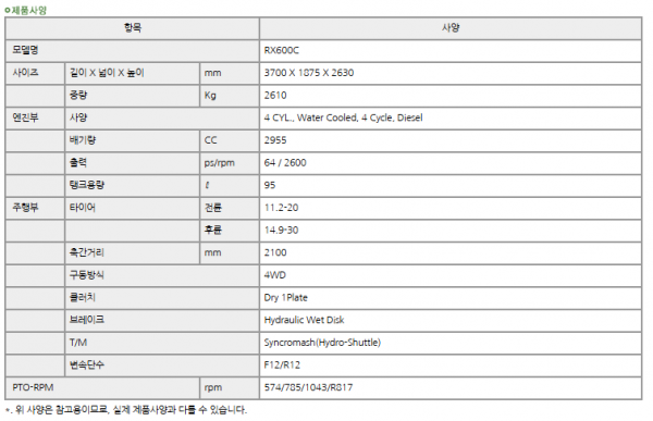 | 제조사 | 대동 | 모델명 | RX600 | 규격 | 60-69hp |
