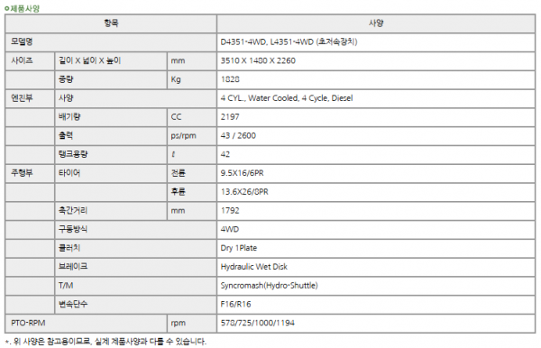| 제조사 | 대동 | 모델명 | D4351 | 규격 | 40-49hp |