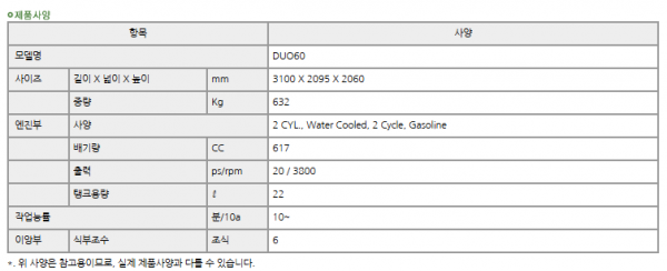 | 제조사 | 대동 | 모델명 | DUO60 | 규격 | 6조식 승용 |