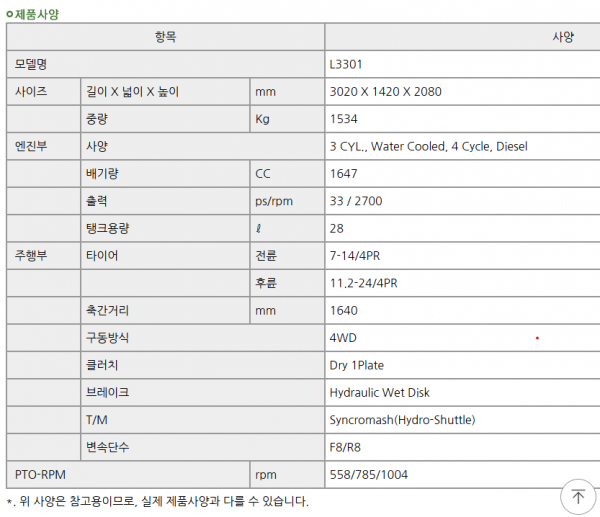 | 제조사 | 대동 | 모델명 | L3301 | 규격 | 33마력 |