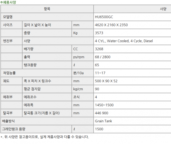 제조사 | TYM | 모델명 | HU6500G | 규격 | 4조식 |