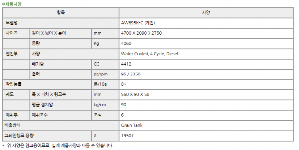 제조사 | 얀마 | 모델명 | AW695K | 규격 | 6조식 (산물형) |