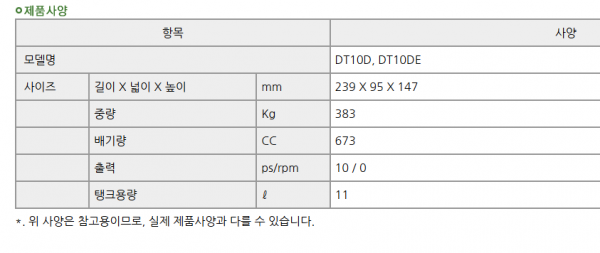 제조사 | 대동 | 모델명 | DT10 | 규격 | 10마력 |