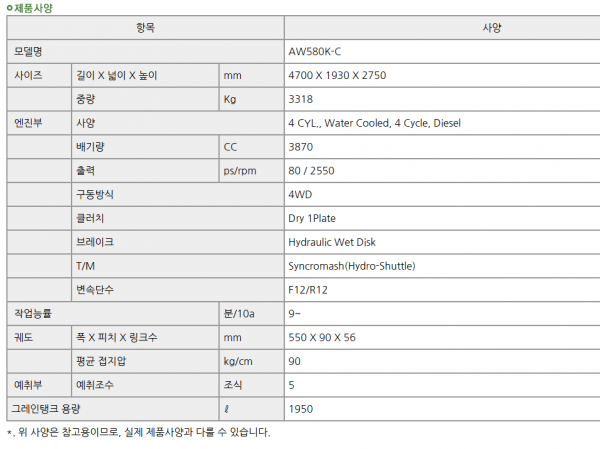 제조사 | 얀마 | 모델명 | AW580 | 규격 | 5조식 |