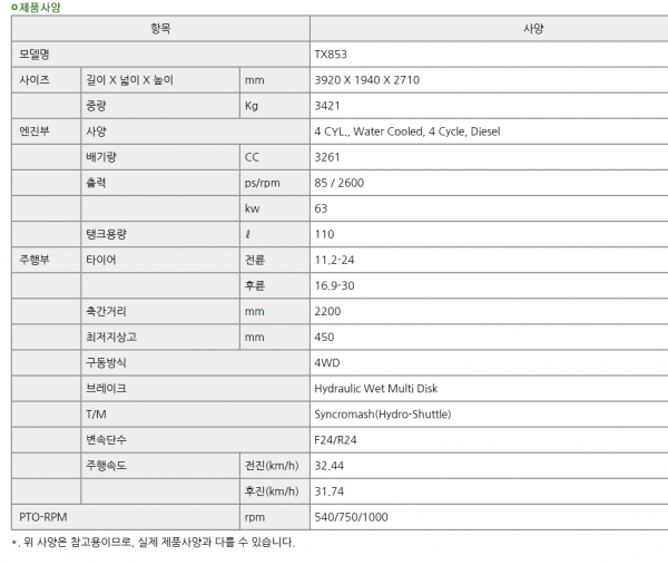 제조사 | TYM | 모델명 | TX853 | 규격 | 85마력 |