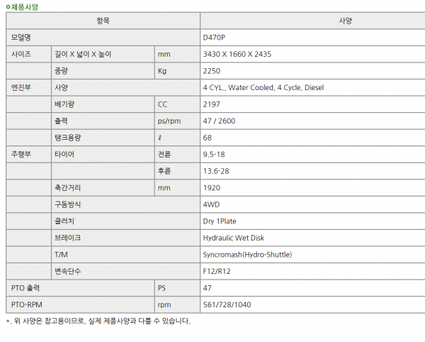 제조사 | 대동 | 모델명 | D470 | 규격 | 47마력 |