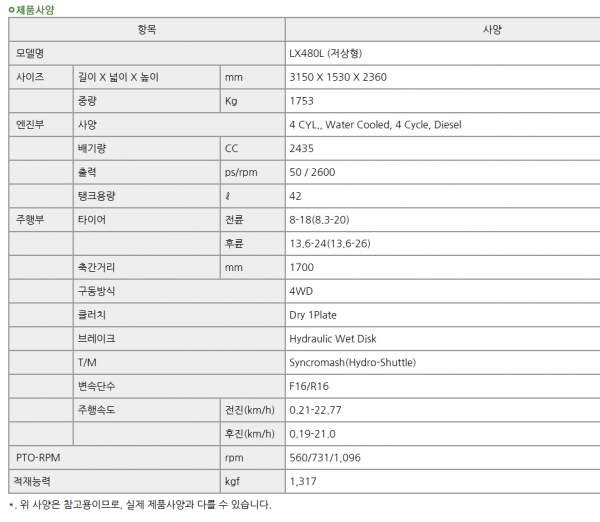 | 제조사 | 대동 | 모델명 | LX480L | 규격 | 48마력 |
