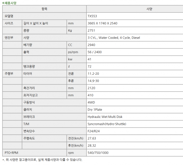 | 제조사 | TYM | 모델명 | TX553 존디어 엔진,파워셔틀,전자 유압 | 규격 | 56마력 |