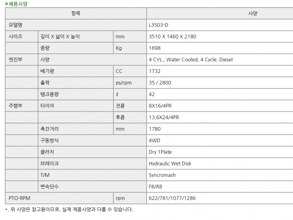 | 제조사 | 대동 | 모델명 | L3503 로더 3503.3502 | 규격 | 35마력 |
