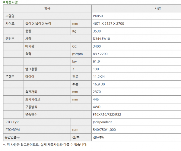 | 제조사 | 대동 | 모델명 | PX850 | 규격 | 83마력 |