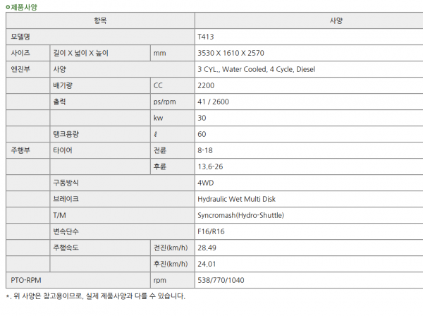 | 제조사 | TYM | 모델명 | T413 로더 로타리 | 규격 | 41마력 |