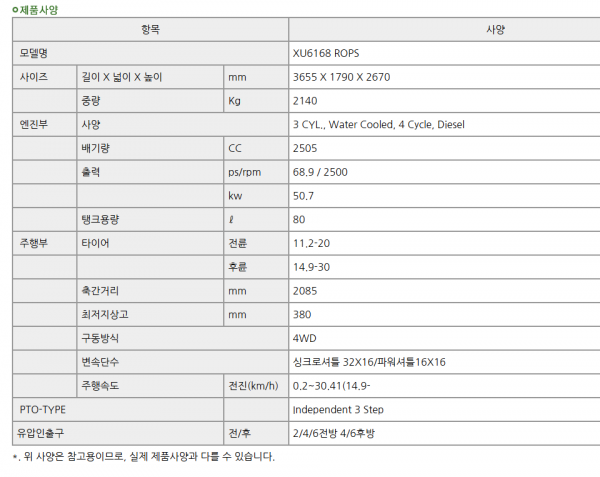 | 제조사 | LS | 모델명 | XU6168 | 규격 | 68.9마력 |
