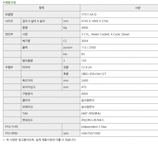 | 제조사 | 얀마 | 모델명 | YT5113A | 규격 | 113마력 |