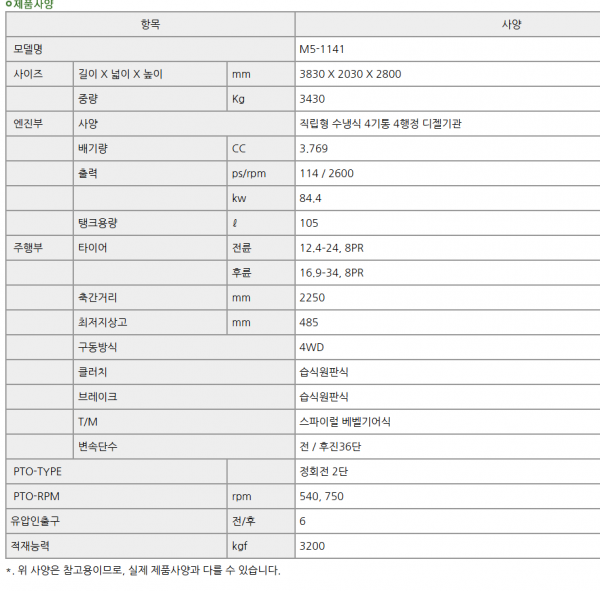 | 제조사 | 구보다 | 모델명 | M5-1141 | 규격 | 114마력 |