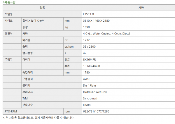 | 제조사 | 대동 | 모델명 | L3503 | 규격 | 35마력 |