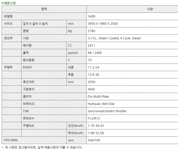 | 제조사 | 존디어 | 모델명 | 5400 | 규격 | 68마력 |