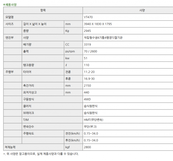 | 제조사 | 얀마 | 모델명 | YT470 | 규격 | 70마력 |