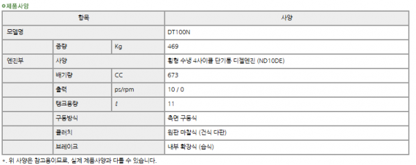 | 제조사 | 대동 | 모델명 | DT100 | 규격 | 10-12마력 |