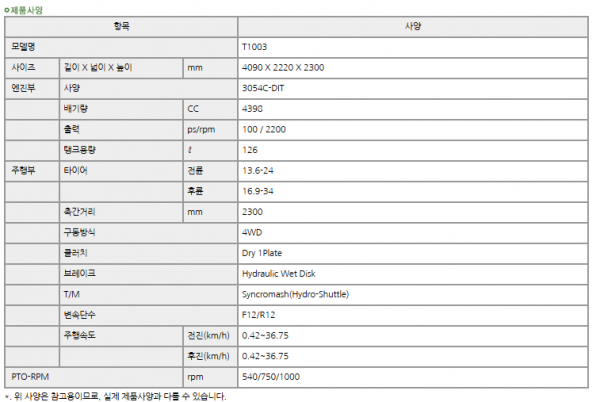 | 제조사 | 동양 | 모델명 | T1003 | 규격 | 100-109hp |