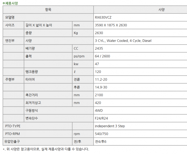 | 제조사 | 대동 | 모델명 | RX630 | 규격 | 63마력 |