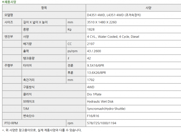 | 제조사 | 대동 | 모델명 | D4351 | 규격 | 43마력 |