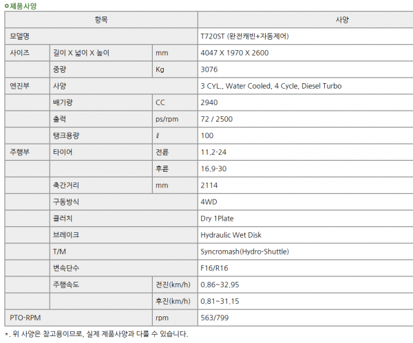 | 제조사 | TYM | 모델명 | T720S | 규격 | 72마력 |
