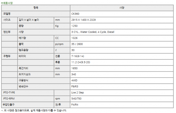 | 제조사 | 대동 | 모델명 | CK360 | 규격 | 30-39hp |
