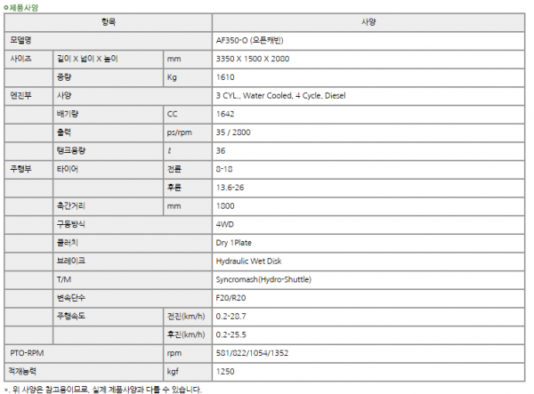 | 제조사 | 국제 | 모델명 | AF350 | 규격 | 30-39hp |